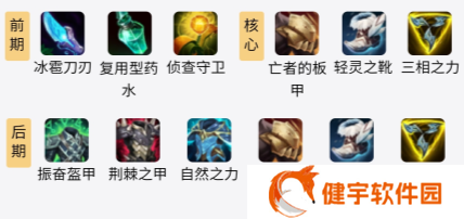 顺风出装:推荐装备包括涡轮炼金罐、明朗之靴、恶魔之拥、亡者的板甲、自然之力和莫雷洛秘典。这种出装可以加快刷野速度,提高前期跑图抓人的效率。