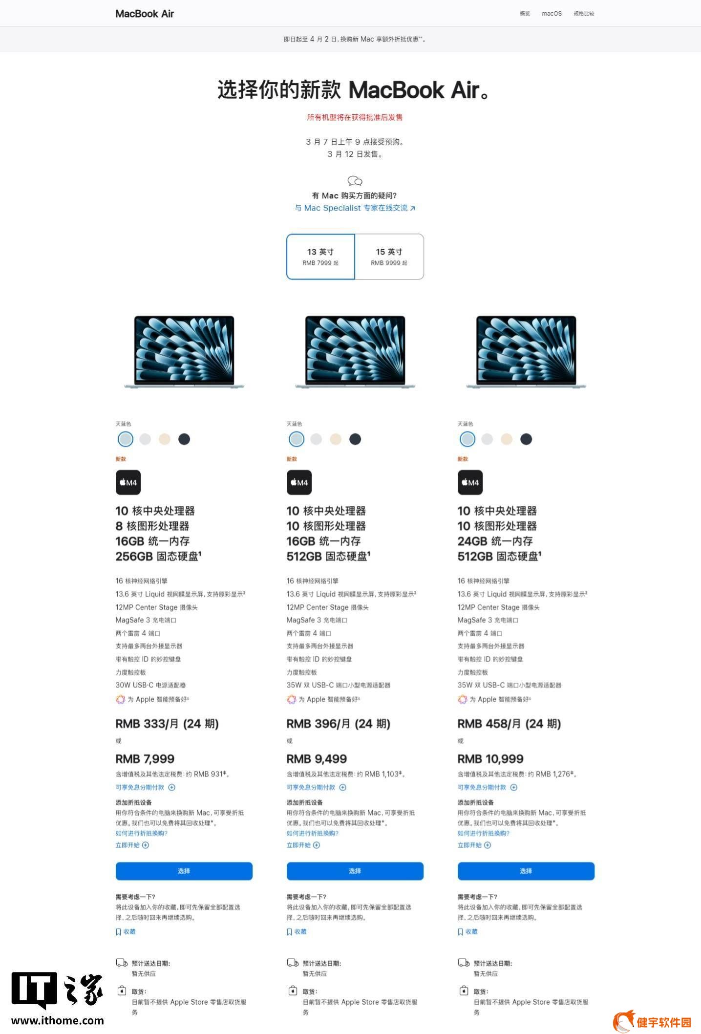 新款MacBook Air现已开放预订,首批产品将于3月12日发货。具体售价方面,13英寸M4 MacBook Air的16+256GB版本售价为7999元(8核GPU),16+512GB版本售价为9499元(10核GPU),24+512GB版本售价为10999元(10核GPU)。而15英寸M4 MacBook Air的16+256GB版本售价为9999元(10核GPU),16+512GB版本售价为11499元(10核GPU),24+512GB版本售价为12999元(10核GPU)。